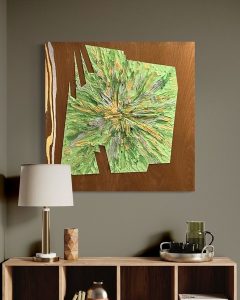 Full Bio: In 2015 I started experimenting with thick, matte, single colors of paint brushed in deep unruly whorls and textures over masked glossy sprayed metallic paint; unmasking removes some of the thick textures and reveals orderly metallic shapes. Thinking abstractly about removal and metal led me to name the paintings after working mines, The metallic color relates (roughly) to the ore being mined. After a 2018 trip to Hawaii, I did a series of paintings named after and inspired by volcanoes around the world. Lately, I’ve been painting on unprimed wood panels, letting the grain of the wood interact with and/or frame the paints and collage elements. I’m intrigued to see the support layer of a piece do more than keep the paint off the wall.